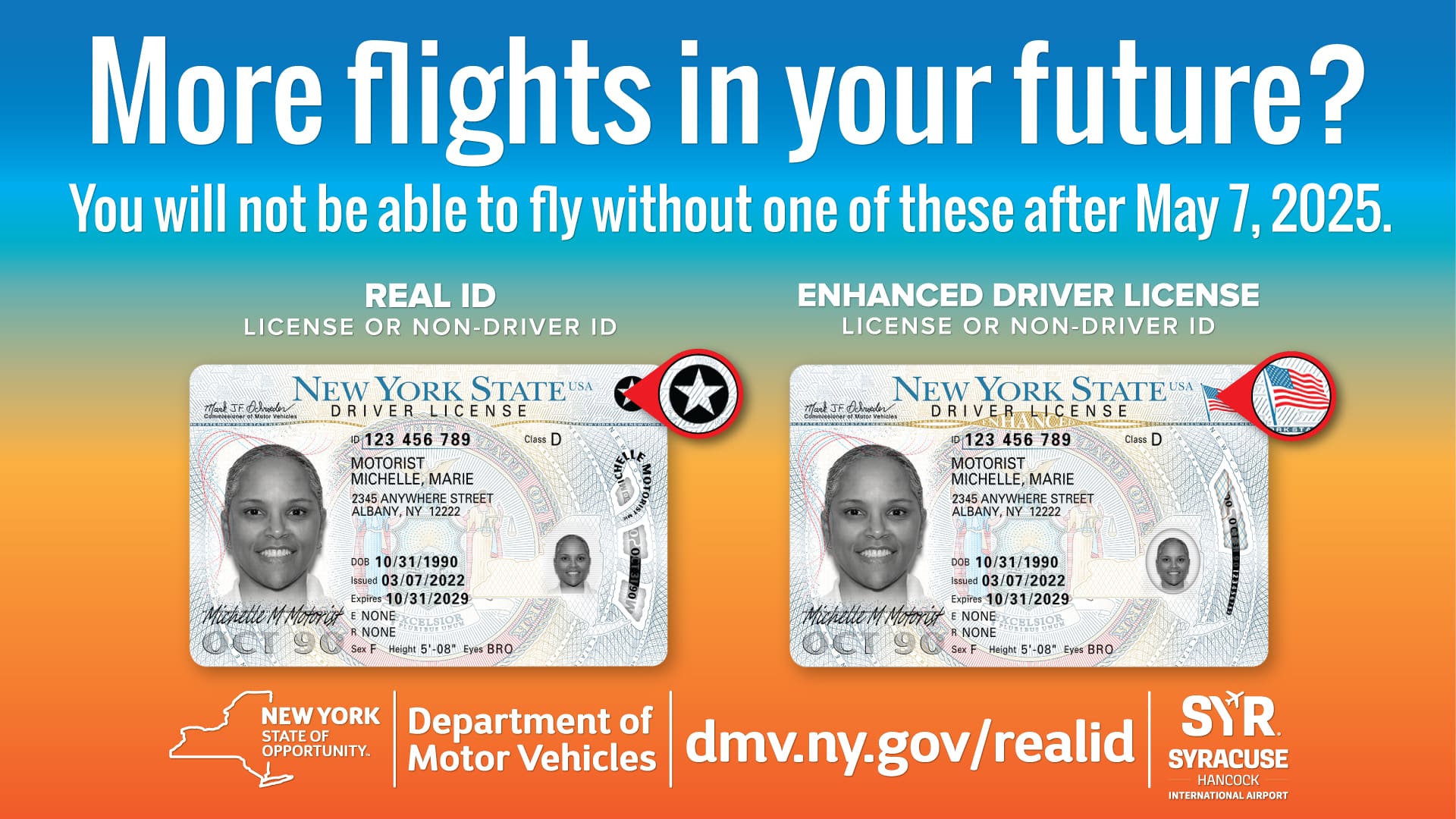Travelers should be advised that as of May 7, 2025, only Enhanced licenses or REAL IDs will be accepted as forms of identification for boarding a domestic flight (unless you already have a Passport).